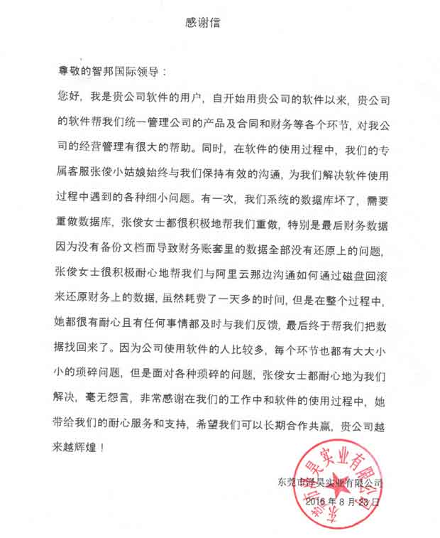 广东东莞泽昊实业有限公司感谢信