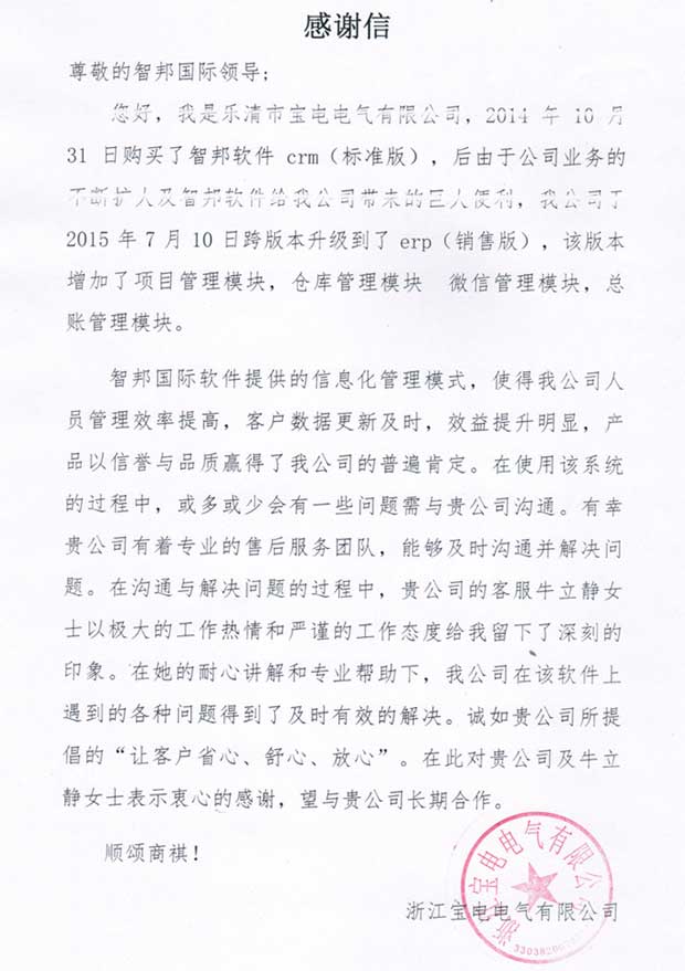 互联网时代,信息高速传输,实现了客户沟通服务的零距离,缩小了企业之间的差距,但也加深了竞争深度和广度,只有采用先进信息科技不断转型升级,才能真正把握新的商机和发展契机。相信在智邦国际ERP系统的协助下,浙江宝电电气有限公司定能实现先进ERP系统与业务流程的完美融合,不断顺应时代发展和市场需求,用实时响应、优异产品留住客户,为不同需求客户提供专业、个性、贴心服务,快速将宝贵商机转化成企业效益。