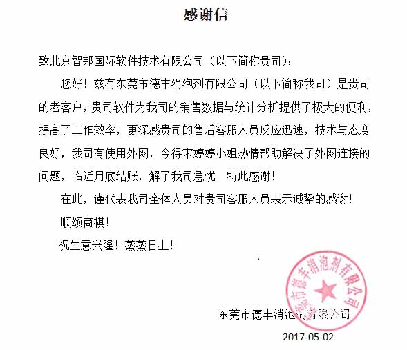 广东东莞德丰消泡剂有限公司感谢信
