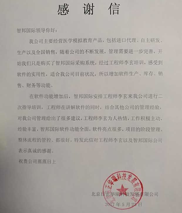 随着信息化系统深入应用,信息化价值逐步显现,在企业管理中的作用也获得越来越多企业认可。相信在智邦国际ERP系统的协助下,北京日正华瑞科技发展有限公司定能顺利走上信息化管理之路,为企业长远发展建立可持续的管理模式,不断提升产品和服务品质,在激烈市场竞争中永葆发展源动力。