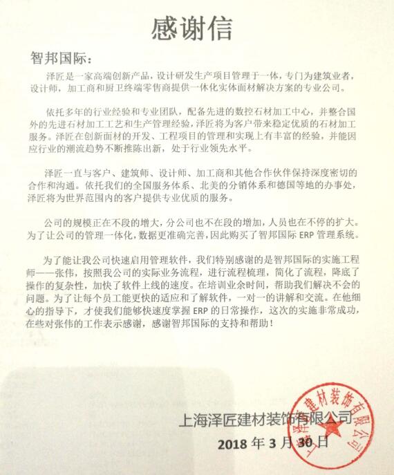 上海泽匠建材装饰有限公司感谢信