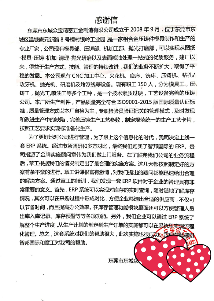 东莞市东城众宝精密五金制造有限公司智邦国际ERP系统感谢信