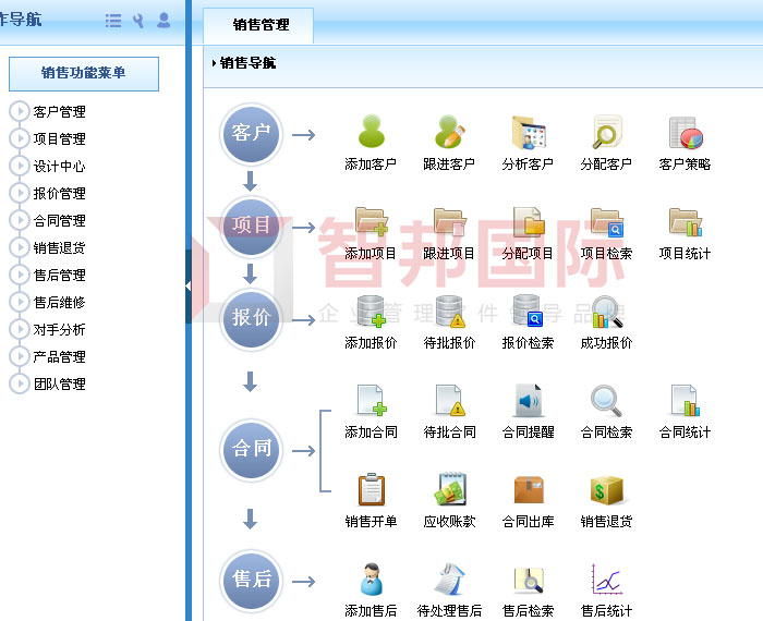 智邦国际工程师在了解到企业基本需求之后,为其演示了智邦国际ERP系统销售版,企业管理层对于系统功能表示认可,经过开会讨论最终决定购买智邦国际ERP系统。智邦国际ERP系统销售版包含销售、营销、库存、财务、人资及办公等功能模块,其中销售环节集成化管理与客户关联的各个环节,透明化实时呈现进度,更是助力销售人员及时跟进意向客户,高效促单。