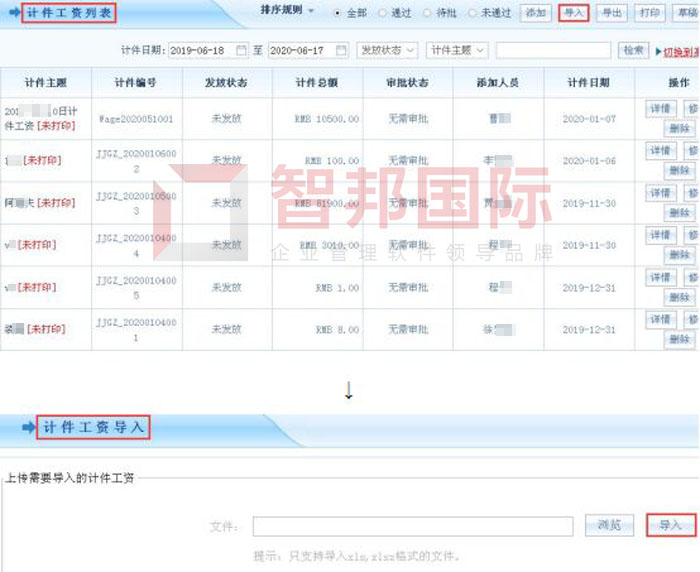 一、在系统计时计件管理环节,支持企业一键导入计件工资、工价信息,或是单个录入计件、计时工资信息。其中一键导入计件工资功能,方便业务人员简单快捷的录入多个计件、计时工资信息,节省时间,有效减少重复性录入的时间、人力耗费以及数据误差等情况的发生,让计件实时精准,高效快速。单个录入则可灵活应变企业计时计件所需,满足企业多元化的生产需求,实现科学计件、合理计时。科学合理地助力企业业务人员高效管理计时计件,灵活应对企业管理所需,提高企业管理效益。