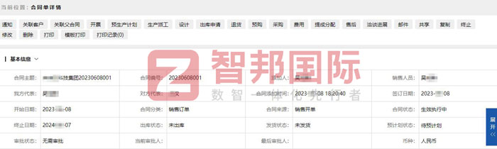 在智邦国际ERP系统中,销售人员线上添加合同后,可根据实际业务需求,由合同一键转设计、出库申请、预购、采购、售后、退货等环节,打破各环节协作沟通壁垒。面对紧急订单,销售部可一键下达“加急派工单”或“预生产计划单”,将订单信息快速推送至生产部门,后续还可通过生产工作台实时查看到每笔订单的生产进度。