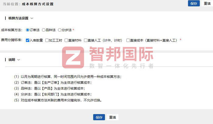 在成本管理模块,智邦国际ERP系统支持一键设置不同费用分摊标准、多种核算方式,如果企业是以生产订单为主体进行成本核算,则选择订单法;如果企业是以产品为主体进行成本核算,则选择品种法;如果企业是以车间部门为主体进行成本核算,则选择分步法。系统中,生产成本自动核算,过程简练、结果精确。