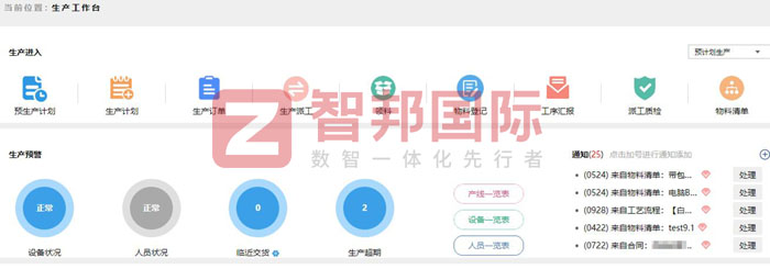 智邦国际ERP系统为企业提供了一站式生产工作台,可一键进入到生产各环节,比如,预生产计划、生产计划、生产订单、生产派工、领料、物料登记、工序汇报、派工质检、物料清单等管理环节,简化繁琐的操作步骤,提高办公效率。另外,系统设有生产预警功能,设备状况、人员状况、临近交货、生产超期等数据,一目了然。