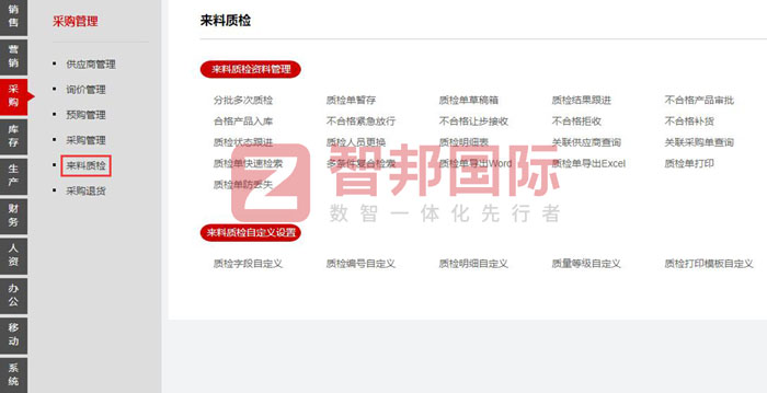 智邦国际机械行业管理系统来料质检功能表(局部图)