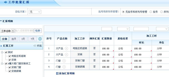 一、系统支持提前设置工序信息,方便生产各阶段有序进行,避免和减少无序生产情况的发生,提高生产效率。工序汇报清晰呈现企业生产运作系统总体方面的计划,以及企业在计划期应达到的产品品种、质量、产量和产值等生产任务的计划和对产品生产进度的安排,管理层及业务人员可通过工序汇报,直观显示当日企业所有生产线的工序进度,进而达到对整个生产进度的实时把控,支持一键批量工序汇报,提高工作效率。还支持对派工单的工序进行替代,方便在人员、设备等突发情况下,企业能及时进行工序替代保证生产继续进行不会停滞,将生产计划、工序等等流程全部放到线上智能把控,信息化管理助力生产可管可追溯。
