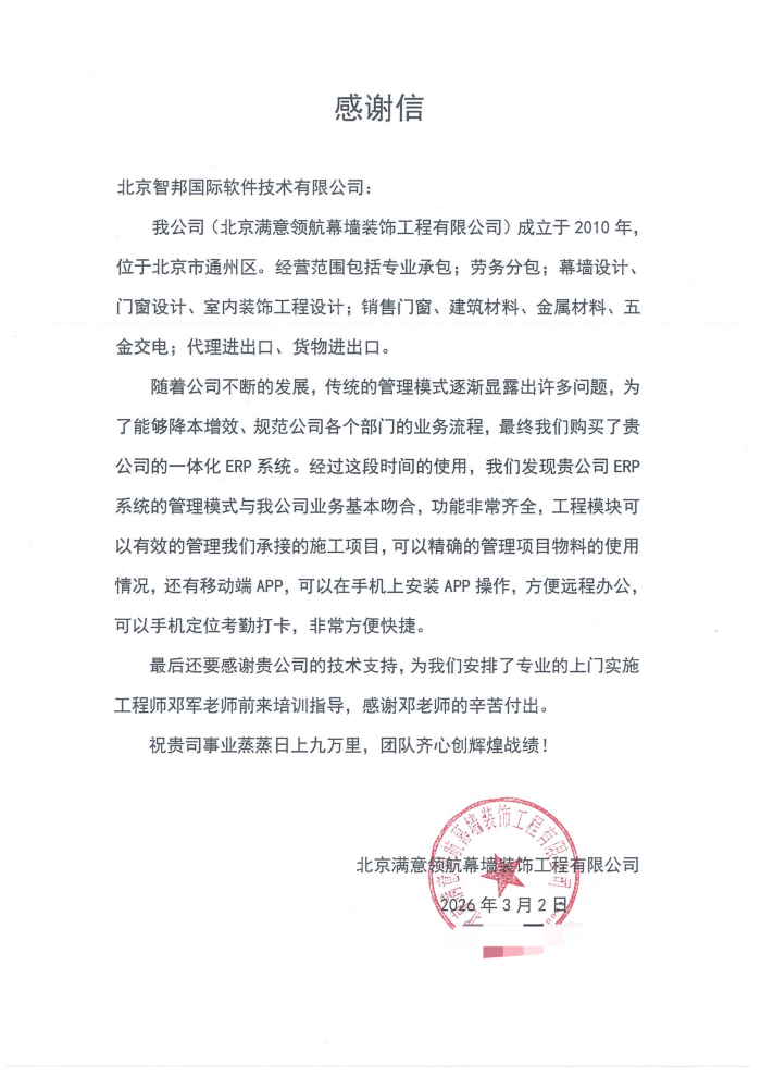 北京满意领航幕墙装饰工程有限公司签约智邦国际,希望通过智邦一体化ERP天时PLUS系列,以透明化、科学化为导向升级企业管理模式,构建覆盖生产、采购、销售、库存的全链路一体化管理体系,深化跨部门高效协同,持续优化运营效率,实现整体经营效能稳步提升。